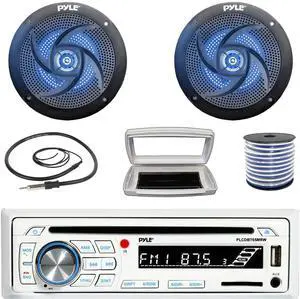 Pyle PLCDBT65 Single-DIN Marine Bluetooth USB/AUX CD Player AM/FM Stereo Receiver W/White Cover, 2x 6'' 240W Max Power Low Profile 2-Way Blue LED Boat Black Speakers W/50 Feet 18G Wire, Radio Antenna