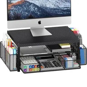 Desk Organizer and Accessories, 2-Tier Computer Monitor Stand with Drawer and 2 Pen Holders, Laptop Stand, Office Desk Accessories for Office Supplies, Carbon Fiber