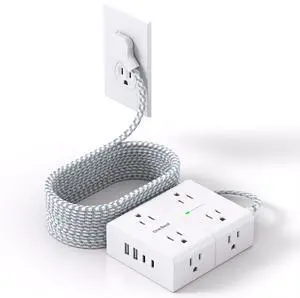 Flat Plug Power Strip Surge Protector 5 Ft Extension Cord with 12 AC Outlets 6 USB Ports 3 Side Multi Plug Outlet Extender Home Office Kitchen Dorm Room Wall Desk Charging Station ETL Listed