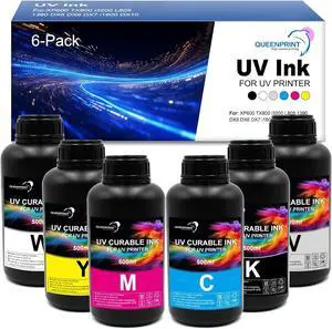 500ML UV Hard Ink (6-Pack, BK C M Y W+V) UV Ink for Hard Materials with XP600 TX800 i3200 DX5 DX6 DX7 i1600 L805 1390 DX10 printhead UV Printers