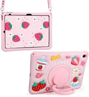 VOFUOE for iPad A16 Case 11th Generation 2025, for iPad 10th Generation Case 10.9 2022 Kids Girls with Shoulder Straps 360 Rotating Stand Sweet Strawberry Yogurt Cake Soft Silicone Cover-Pink
