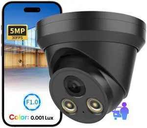 VIKYLIN 5MP Full Color Night Vision POE IP Security Turret Outdoor Camera(Black),F1.0 Super Aperture,AI Human/Vehicle Detection,Built in Mic,2.8mm Lens,IP67,5MP@30fps