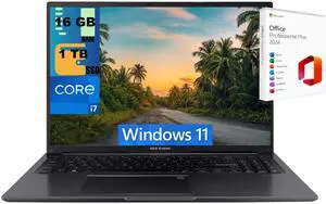 ASUS Vivobook 16 Laptop, 16" WUXGA Display, Intel Core i7-1355U 10 Cores Processor, Intel Iris Xe Graphics, 24GB DDR4  1TB PCIe SSD, Wi-Fi 6, Bluetooth 5.1, Windows 11 Pro ,Office 2024 License