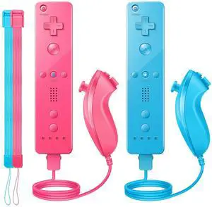 Wii Controller 2 Pack, Wii Remote Controller and Nunchuck Joystick with Silicone Case and Wrist Strap for Holiday (Pink and Blue)