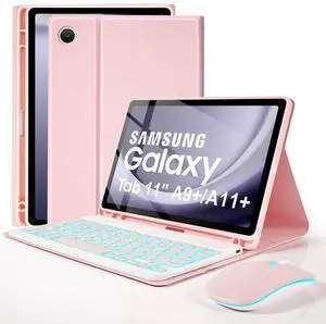 kantaj Backlit Keyboard Case with Mouse for Samsung Galaxy Tab A9 Plus 11 inch, Dechatable Wireless Bluetooth Keyboard, Smart Cover for Galaxy A9 + Tablet Case with Keyboard and Pencil Holder, Pink
