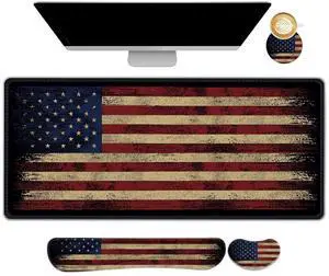 NXZGO Desk Mat Pad, Gaming Mouse Pad Wrist Support Set, 4 in1 Non-Slip XXL Large Mousepad + Ergonomic Keyboard Wrist Rest+Mouse Wrist Rest+Coaster for Home Office PC Computer I Vintage American Flag