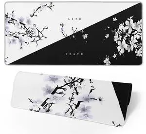 Japanese Life Death Keyboard Mat, Black White Japanese Anime Gaming Mouse Pad for Desk with Anti-Slip Rubber Base and Stitched Edges, Japanese Sakura Pagoda Sun Mouse Pad