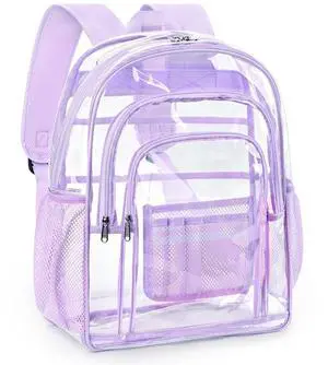 ZORFIN Clear Backpack Heavy Duty for School & Work 17in Transparent PVC Bag with Large Capacity & Reinforced Straps See Through Bookbag for Men, Women, Boys & Girls, Workplace Security - Purple
