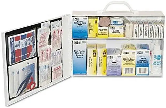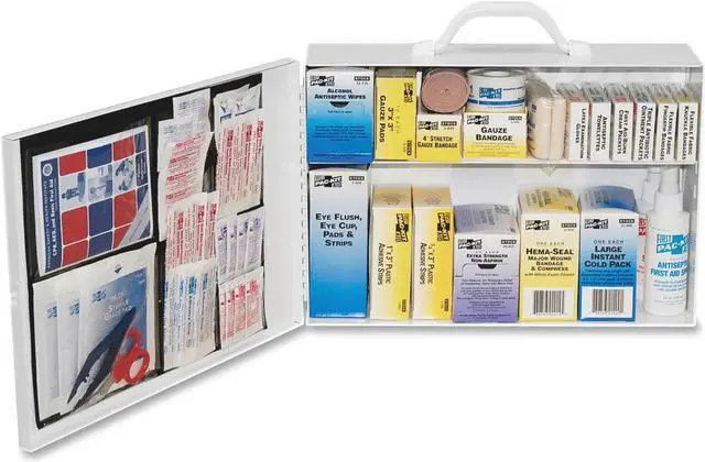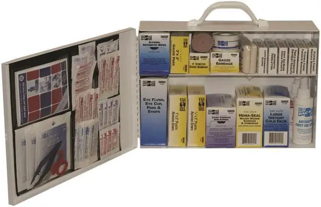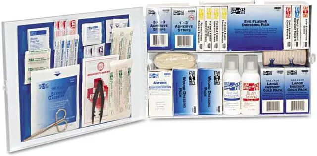 Pac-Kit Safety Equipment 75-person First Aid Kit - 443 x Piece(s) For 75 x Individual(s) - 11" Height x 15.5" Width x 4.8" Depth - Steel Case - 1 / Kit 75-person, two-shelf, industrial first aid kit features a durable, steel case for maximum protection. OSHA-compliant box is designed with a handle for easy carrying and can be mounted on the wall. Contents meet or exceed requirements of ANSI Standard Z308.1-2009. Items in the kit include adhesive strips, woven extra-large strips, woven knuckle bandages, gauze pads, hema-seal trauma dressing, gauze bandages, adhesive tape, triangular bandages, antiseptic wipes, first aid/burn cream packets, triple antibiotic ointment packets, BZK antiseptic wipes, eyewash, burn spray, extra-strength non-aspirin tablets, instant cold packs, elastic bandages, exam gloves, scissors, forceps and first aid guide.