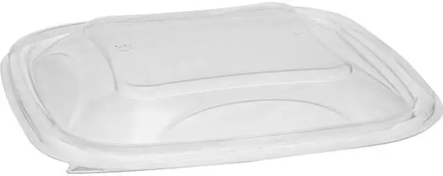 Resistant to cracking and leaking, pairs perfectly with the square recycled plastic bowl to keep your food fresh. Its not only beautifully made to showcase food, the lid is easy to snap on with a secure lockand food application is mess-free. Good for delivery and takeout, these clear containers make order identification quick, and theyre highly durable and easily stackable. Made with post-consumer PET recycled plastic bottles and help reduce landfill waste. Food Container Type: Lid; Material(s): PET; Food Container Material Type: Plastic; Color(s): Clear.