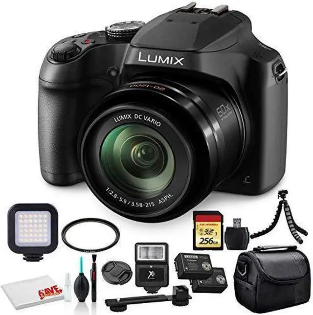Manufacturer Included Items: Panasonic Lumix DC-FZ80 Digital CameraRechargeable Lithium-Ion BatteryAC AdapterUSB CableShoulder StrapLens CapLens Cap StringBundle Items Include: 1 x Panasonic Lumix DC-FZ80 Digital Camera1 x 256GB High Speed UHS-I SDXC U3 Memory Card1 x Portable LED Video Light1 x DMW-BMB9 Battery1 x Universal Digital Camera Flash1 x Deluxe Soft Medium Camera and Video Case Bag1 x 12 Inch Flexible Tripod1 x Deluxe Cleaning Set1 x 55mm UV Filter1 x USB Card Reader