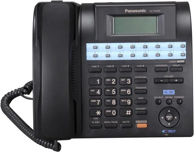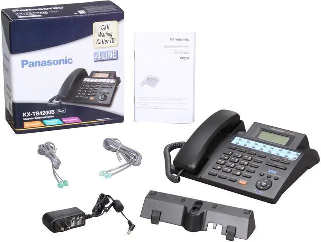 Panasonic KX-TS4200BThe Panasonic KX-TS4200B 4-line integrated phone system is expandable up to 16 stations. Packed with advanced business features, it includes a speakerphone, call waiting/caller ID and the ability to expand to a multi-unit system without a central switching unit. This KX-TS4200B can be networked into a system of up to 16 phones without the need for an expensive PBX or key phone system. All the features you need, such as transfer, intercom, conference and hold, are built into this phone. This Panasonic phone also has a 200-station phonebook and caller ID memory with dialer and power outage operation.KX-TS4200B Features:Corded Phone System 4-Line Operation Caller ID / Call Waiting Expandable Up To 16 Stations Speakerphone Backlit LCD Display Power Failure Protection 24-Digit Per Station Dialer Storage Capacity 32 One-Touch Memory Buttons 200 Station Name / Number Caller ID Memory 200 Station Phone Directory / Dialer Message Waiting Indicator Intercom 3-Way Conferencing 6 Number Redial Flash 5-Step Volume Control 4-Step Ringer Volume Control 8-Step Speakerphone Volume Control Bilingual Menu Support (English / Spanish) Line SelectionGroup / Prime / Auto Do Not Disturb Real Time Clock AM / PM Format 2 Desktop Angle Choices Wall Mountable/Mount Included 2.5mm Headset Jack Mute Hold Call Transfer