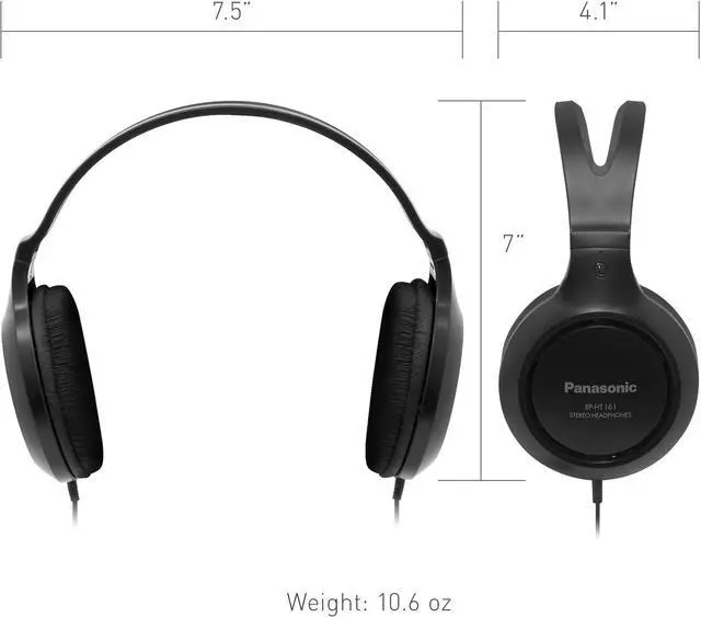 The sleek, matte-black finish and durable, lightweight design of the Panasonic Headphones RP-HT161-K Full-Sized Over-the-Ear Lightweight Long-Corded add a distinctive look of style and comfort while you enjoy music at home, around town, when travelling or anywhere else you go.