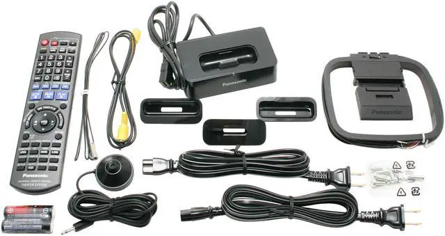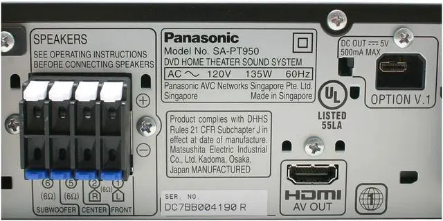Your home theater will be up and running in no time with this complete Panasonic system, which includes wireless rear speakers and an RF transmitter. Hook it up to your TV, and you'll have all you need for the full theater experience: a 5-disc DVD changer, home theater receiver, 5 sleek surround-sound speakers, a powerful subwoofer, and a Panasonic universal iPod dock.