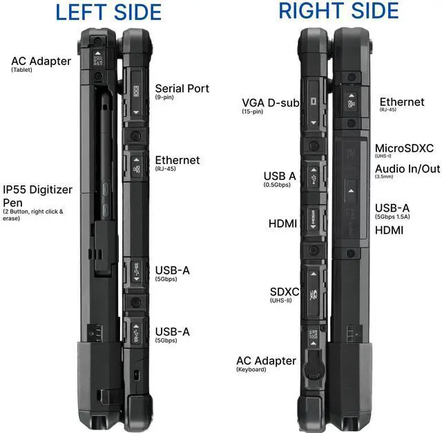 Ports - On the keyboard: Docking Connector, 1x USB 3.0, 1x USB 2.0, SDXC, HDMI, VGA, 10/100/1000 Ethernet, Serial (USB)