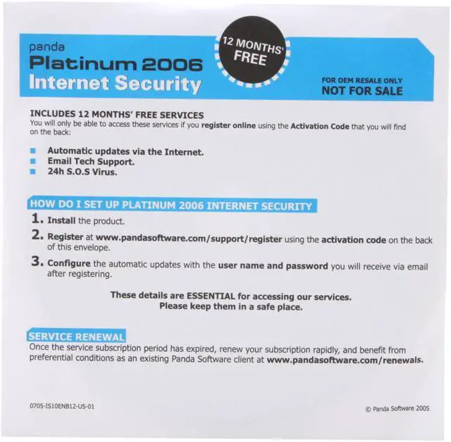 | Feature | The new Panda Platinum 2006 Internet Security offers the most effective protection against viruses, spyware, hackers, phishing, spam and other Internet threats , so you enjoy the Internet with peace of mind. To guarantee your security, it offers a double layer of protection against unknown viruses and intruders through its TruPrevent Technologies. |
