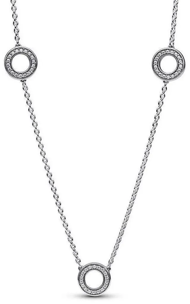 Elevate your style with the Pave Circles Chain Necklace by Pandora. Crafted in sterling silver this versatile piece features three Pave circles equally spaced along the cable chain. Each circle features polished sides and a row of clear cubic zirconia accentuated by a raised polished line. The length of this necklace is adjustable making it a perfect addition to any outfit. Inspired by the shine of Pave halos this necklace is perfect for everyday wear and pairs effortlessly with other necklaces for a personalised look.