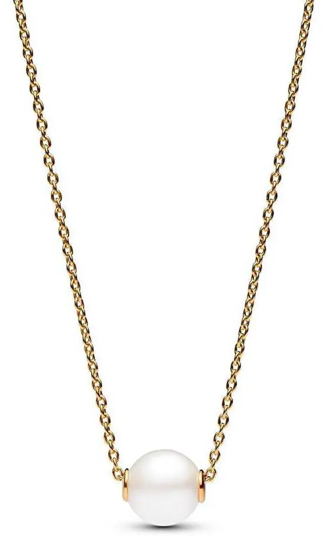 Elevate your style with our Treated Freshwater Cultured Pearl Collier Necklace from our Pandora Timeless collection. This 14k gold-plated piece features an adjustable cable chain with a luminous treated freshwater cultured pearl pendant. A clear cubic zirconia by the clasp adds a touch of sparkle. This necklace represents the fusion of classic and contemporary making it a perfect choice for both casual and special occasions. Please note that each treated freshwater cultured pearl is unique and can vary in size and colour - normal wear and tear may occur with this material. Our freshwater cultured pearls are treated with bleaching and lustre enhancement.