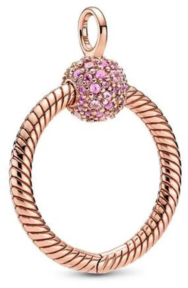 For a new way to wear your charms look to the Pandora Moments Small Pave O Pendant. Hand-finished in Pandora Rose (14k rose gold-plated unique metal blend) this piece takes design cues from the Pandora Crown O monogram and the Pandora Moments snake chain bracelets. Featuring a ball clasp with synthetic pink sapphires and a heart-shaped button on the back style this piece on a thick cable chain necklace and wear up to three charms dangles or pendants.