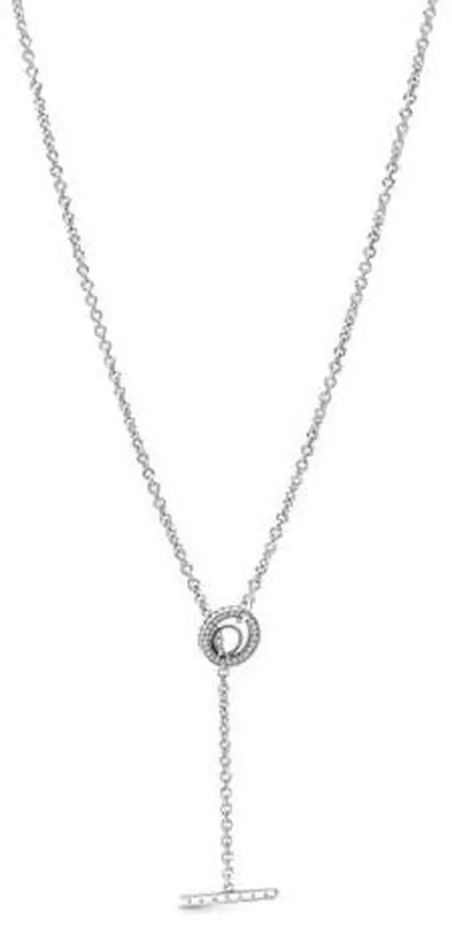 Drape yourself in elegance with the Pave Circle Logo T-bar Heart Necklace. Designed to suit any mood this adjustable necklace is hand-finished in sterling silver and includes sparkling clear cubic zirconia stones. The chain features two spaced-out double circles the smaller micro-beaded circle nested inside the large one which features cut-out hearts pave and Pandora logo.