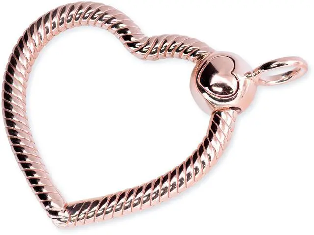 Go stylishly asymmetrical with the Pandora Moments Heart Charm Pendant. This pendant is hand-finished in 14k rose gold-plated metal and features an openable rigid snake chain heart outline. The heart hangs at an angle and includes a ball-shaped clasp with a Pandora logo. This pendant can be styled with up to three charms dangles or pendants (except select long charm styles) and should be worn on a thick cable chain necklace for comfort and security.