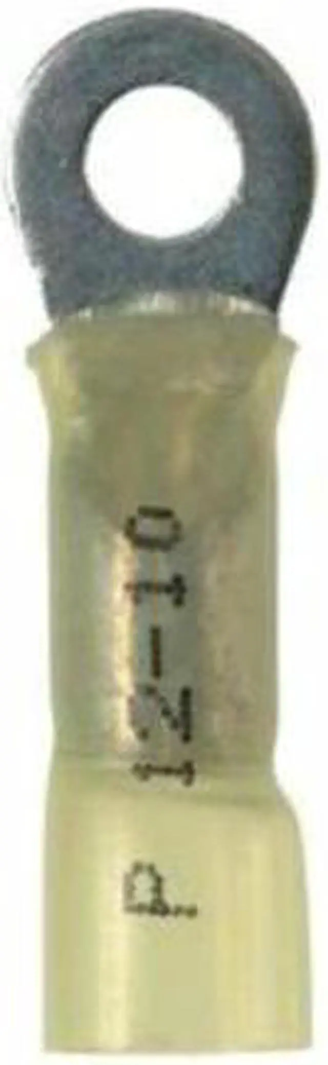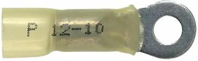 Ring Terminal, Insulation Color Yellow, Insulation Material Heat Shrink, Maximum Temperature 257 Degrees F, Maximum Voltage 600 V, Minimum Wire Size 12 AWG, Maximum Wire Size 10 AWG, Termination Style Crimp, Tongue Width 0.37 in, Contact Finish Tin, Contact Material Copper, UL 94 Flammability Rating HB, V-2, Standards CSA C 22.2 No. 65, UL 486A, UL 486B, Barrel Length 0.25 in, Barrel Style Brazed, Compatible Grainger Part Number 377D97, Compatible Manufacturer Model Number CT-310. This item has been restricted from sale in the following state (s): []