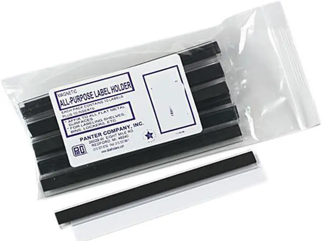 Heavy-duty clear plastic holders with magnetic backings for easy repositioning or removal from metal surfaces. They easily attach to file cabinets, drawers, shelves, and other metal surfaces which require labeling. Includes blank inserts. Color(s): Clear; Size: 6 x 1/2; Load Style: Side; Material(s): Plastic.