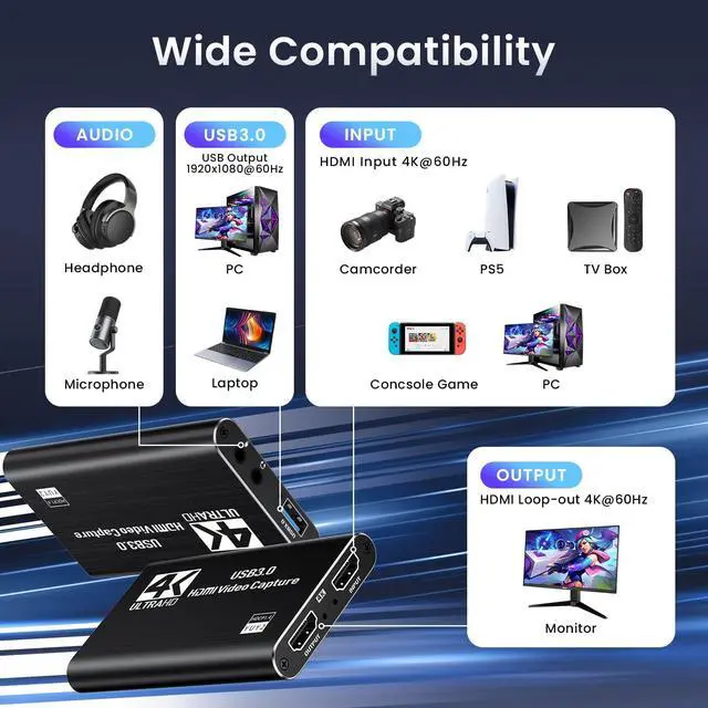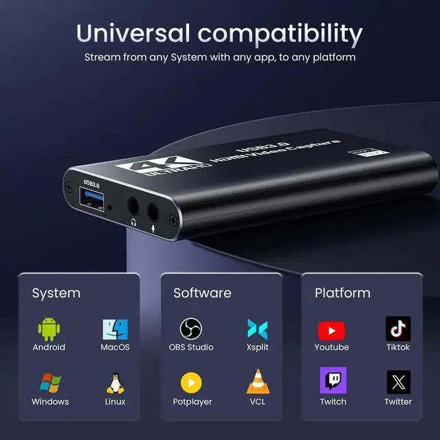 Broad CompatibilityCompatible with Windows and macOS. High-speed USB 3.0 and ultra-low latency technology provide a seamless experience for live streaming or recording via OBS, VLC, PotPlayer, Twitch, YouTube, Facebook, and more