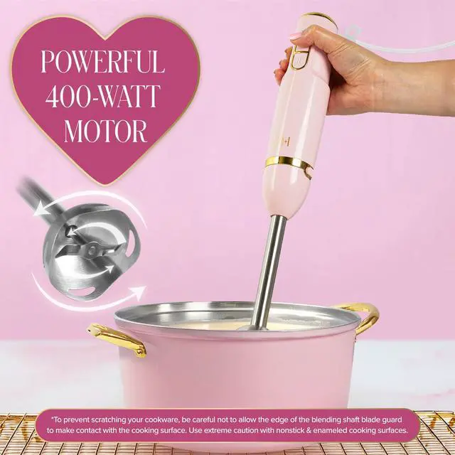 2-SPEED, 400W MOTOR Whip, blend, and puree like a pro with a powerful 400-watt motor and easy push-button control. The Paris Hilton immersion blender handles everything from silky soups to baby food.