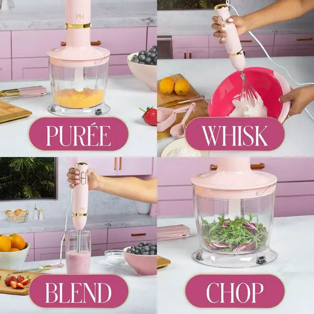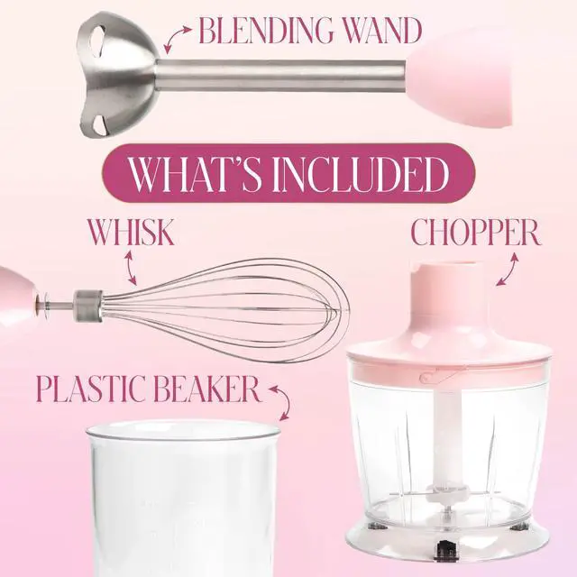 3-in-1 VERSATILITY This chic set includes a detachable blending shaft with a blending cup for smoothies, soups, and sauces, a whisk attachment for whipped cream or eggs, and a chopping bowl for vegetables and salsasgiving you versatility in one glam tool.