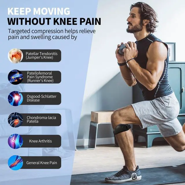 Disperse Impact & Relieve Pain Our patellar tendon support strap features a medical-grade silicone pad that absorbs and disperses shock during jumping, running, and squatting. It effectively helps relieve anterior knee pain caused by patellar tendinitis (jumper's knee), osgood-schlatter, patellofemoral pain syndrome, chondromalacia, patellar instability, and subluxation. By reducing pain, it prevents compensatory movements and improper form, helping you avoid further injury