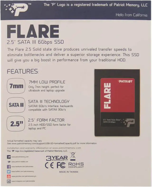 The Patriot Flare Solid-State Drive (SSD) is the perfect way to reduce OS and applications loading time and enhance your system response. It's built using MLC NAND and a Phison S11 controller, and operates over SATA 6Gbps host interface which is backwards compatible with SATA 3Gbps & 1.5Gbps specifications. It features LDCP (Low Density Parity Check) ECC recovery for data integrity, and incorporates static and dynamic wear leveling, bad block management, low power management, trim support and smart zip for consistent performance over an extended lifespan. And 7mm thickness allows fit into various systems including laptop, Ultrabook and desktop. Eliminate the storage bottleneck with the Patriot Flare SSD.
