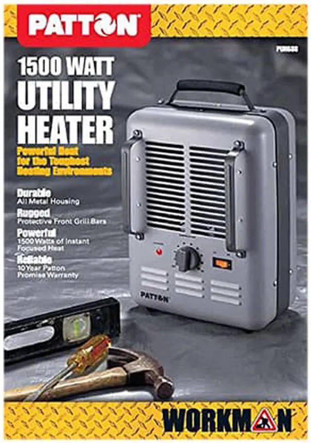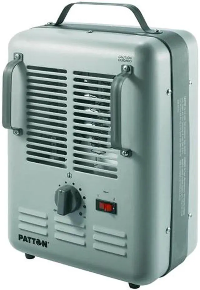 The Patton Milkhouse Heater has the rugged, all metal housing makes this fan heater ideal for the garage, workshop or job site. For your convenient a Comfort Control Thermostat and high and low heat settings allow you set the heat to a level that's just what you want. Front guards have also been added to protect the unit in case of tip over. Fan forced heat with automatic thermostat low and high settings; Front guards and auto shut-off if tipped over; Great for heating open areas like the basement, garage, or workroom.