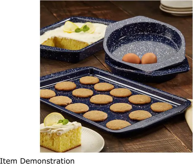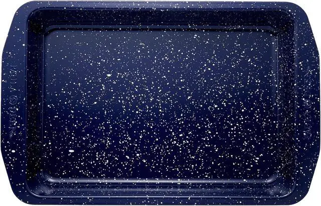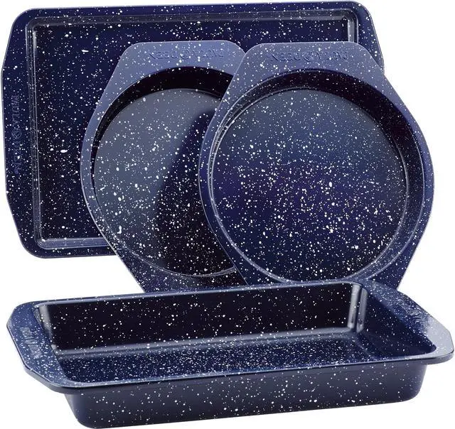 | Special Features | With the handy, colorful Paula Deen Speckled Nonstick Bakeware 4-Piece Bakeware Set, baking dreams become reality because everyone has a perfect set of pans for making home-baked treats. Imagine catching a buttery whiff of fresh home-baked cookies, cakes, and other delicious treats baking in the oven with Paula Deen! Whether you bake on a daily basis or your sweet tooth only craves some homemade sugar every once in a long while, the sturdy, colorful nonstick bakeware is sure to become a perfect kitchen partner. Each baking pan features durable steel construction and rolled rims that resist warping. The pans are coated inside and out with long-lasting nonstick that aids in even browning of baked goods, helps with easy food release, and makes cleanup a breeze. Paula Deen Speckled Bakeware adds charming, down-home design to baking with a speckled color pattern inspired by those adorning vintage enamelware and other classic kitchenware. The set includes a pair of round cake pans, a cookie sheet, and a rectangular cake pan, each piece perfect for whipping up a chewy batch of snickerdoodles or one of Paula's yummy cakes. The wide handles offer a confident grasp even with your favorite oven mitts, and the bakeware is oven safe to 450°F. Fill the kitchen with the sounds of baking joy and the scent of freshly-baked goodies galore, using the convenient, versatile Paula Deen Speckled Nonstick Bakeware 4-Piece Bakeware Set. |