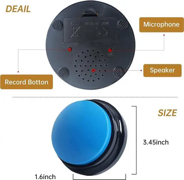 This is a button with a recordable sound. It can be used as a parent-child interactive toy, a child's language educational toy, or used in games between families, companies and friends.