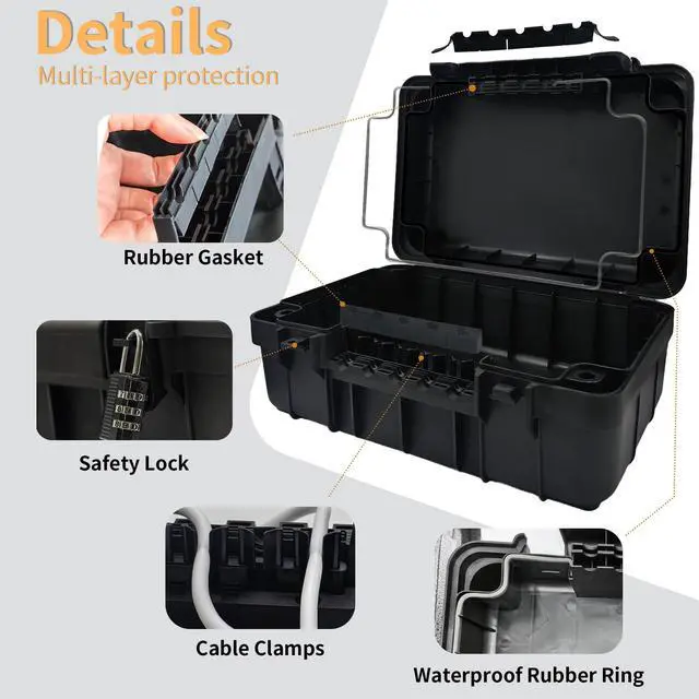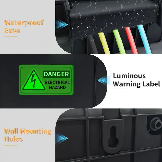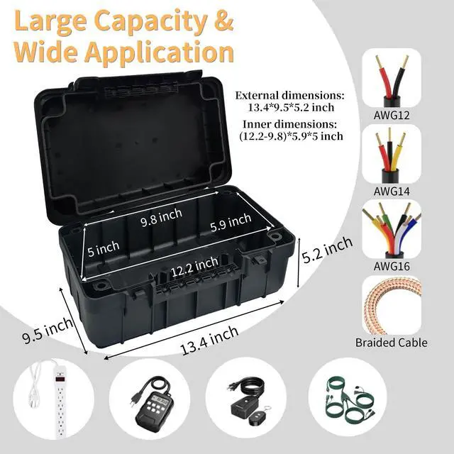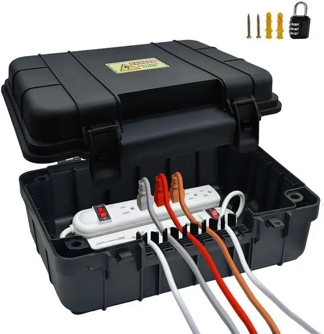 Paxboxtech Large Outdoor Electrical Box Heavy-Duty Weatherproof Enclosure for Extension Cords, Power Strips & Outdoor Electronics (13.4x9.5x5.2 Inches, IP54 Rated, Black) Keep your outdoor electrical connections safe, dry, and organized with the Paxboxtech Large Outdoor Electrical Box. Designed for durability and protection, this IP54 waterproof outdoor extension cord cover shields your power strips, outlets, plugs, timers, and holiday lights from rain, snow, dust, and debris. Key Features: Weatherproof & Durable Construction Made from high-impact, UV-resistant polypropylene, this weatherproof outlet storage box withstands harsh outdoor conditions while preventing corrosion and damage to your electronics. Spacious & Versatile Design Measuring 13.4 x 9.5 x 5.2 inches, this large enclosure fits extension cords, power strips, smart plugs, timers, and multiple sockets with ease. Perfect for holiday lights, garden tools, and outdoor appliances. Secure IP54 Waterproof Rating The tight-sealing lid and IP54-rated protection keep moisture, dirt, and insects out, ensuring safe and reliable power in any weather. Easy Access & Cable Management Features a removable lid for quick access and built-in cord openings to keep wires neatly organized while maintaining a weatherproof seal. Universal Compatibility Works with most standard power strips, GFCI outlets, smart plugs, and timers, making it ideal for patios, decks, gardens, Christmas lights, and RV/camping setups. Ideal For: Protecting outdoor extension cords, power strips, and outlets from rain and debris Organizing and concealing holiday light connections, inflatables, and decorations Safeguarding electrical timers, smart plugs, and sockets in wet environments Storing pool, sprinkler, or landscape lighting wiring securely Upgrade your outdoor electrical safety with the Paxboxtech Waterproof Outdoor Electrical Box the ultimate solution for weatherproof, dustproof, and tamper-resistant power protection.