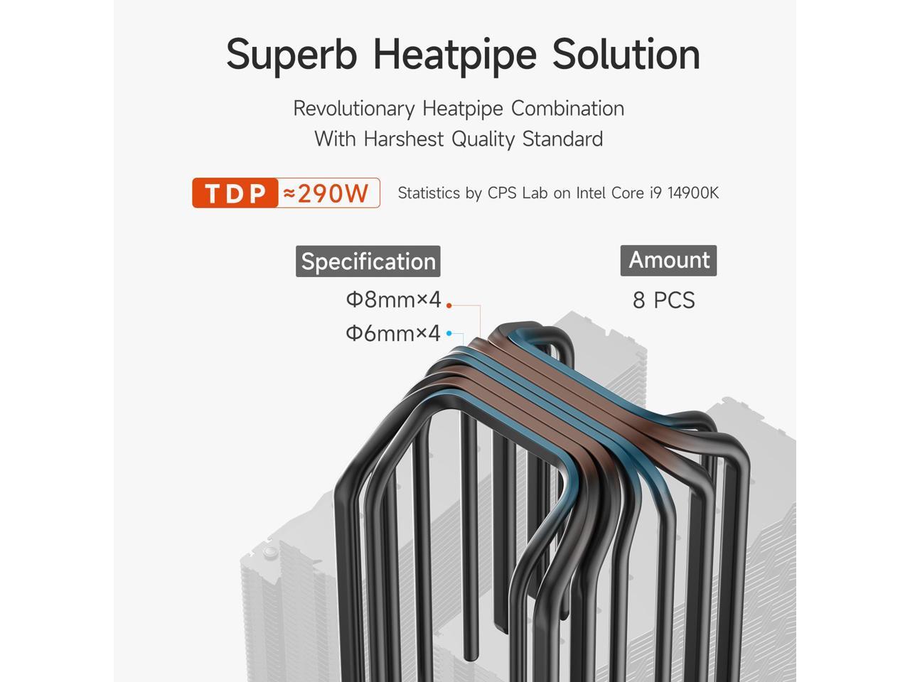 High-Performance Cooling: Equipped with 8 high-performance heat pipes (4 x 8mm + 4 x 6mm), offering superior cooling efficiency with a 290W TDP.