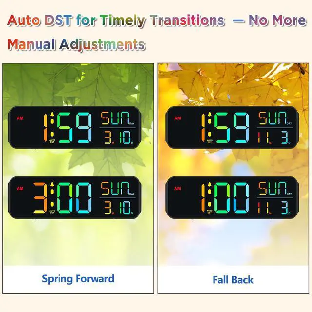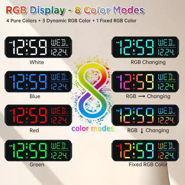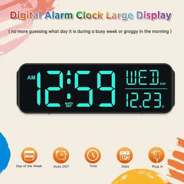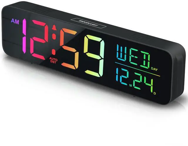 Peakeep RGB Digital Alarm Clock Large Display, Date Day of Week Desk Clock for Bedroom Living Room, Corded Electric Large LED Colorful Color Changing Numbers Dimmable, Auto DST