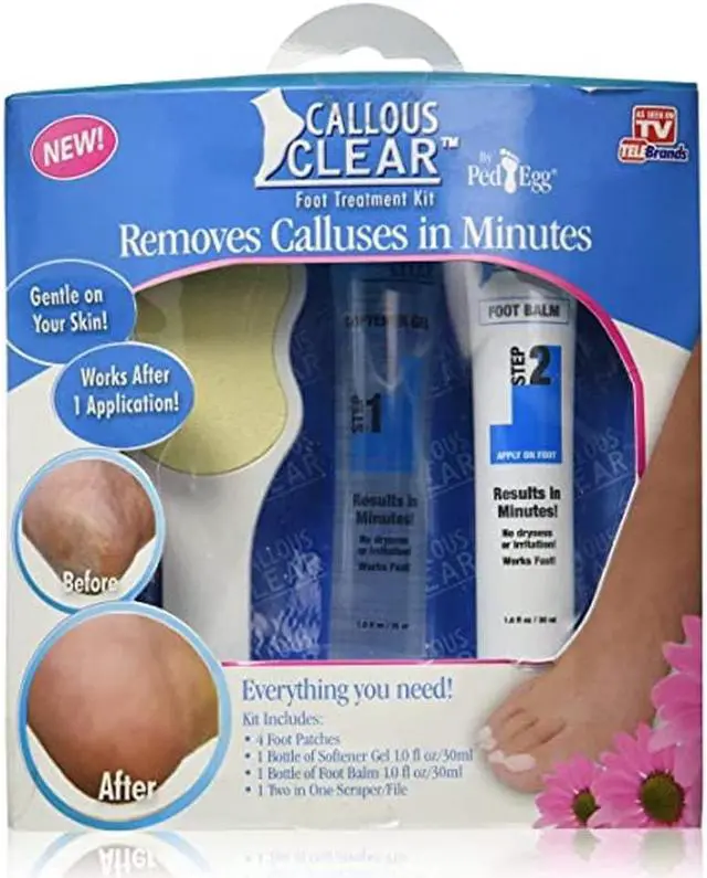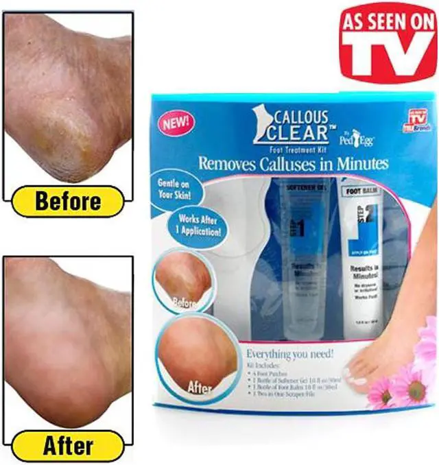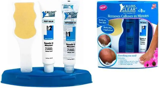 Callous Clear Foot Treatment Kit Removes calluses in minutes. Gentle on your skin, works after one application. Embarrassed by ugly calluses? Wish you could make them disappear? Easily remove calluses for Spa perfect feet! Callous Clear is the newest and fastest way to make your feet feel smooth and healthy with no mess! Just apply the Callous Clear callous softening cream to the special callous removal patch, place the self-sticking patch on the calloused area and relax as it softens and moisturizes your feet. Callous Clear penetrates into the hard, calloused areas, softening and lifting so that, in just minutes, the calluses peel! Then, simply file for a smooth, soft finish and apply the soothing Callous Clear heel balm.