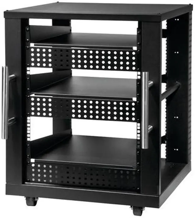 | Features | Designed for managing components and providing an organized professional look to any A/V installation Fully assembled reduces installation time Sturdy shelves accommodate most components Rubber casters provide easy placement inside closets or against walls Integrated cable management clips assist with routing multiple bundles of cables Open air vented panels, top and sides keep components cool Removable handles provide ease of movement Included three 2U shelves |