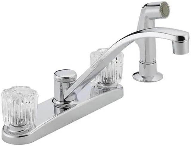 Peerless Choice Double Knob Handle Kitchen Faucet with Chrome Side Sprayer - Chrome finish, 2 clear knob handles, 9" long spout, 8" center, 4-hole installation. 8" swivel spout, chrome finish spray. Water efficient 1.8 GPM (gallons per minute) flow rate at 60 psi (pounds per square inch). 1/2" I.P.S. (iron pipe size) 1-1/2" deck thickness. Lifetime limited faucet and finish warranty to original consumer purchaser. Choice series. - Number Of Handles: 2-Handle, Handle Type: Knob, Finish: Chrome, Faucet Holes: 4 Hole, Faucet Centers: 8 In., Flow Rate: 1.8 gpm, Side Sprayer: Yes, Spout Reach: 9 In., Overall Height: 7-1/16 In., Valve Type: Washerless stem cartridge, ADA Compliant: No, Warranty: Lifetime, Pkg Qty: 1, Package Type: Box