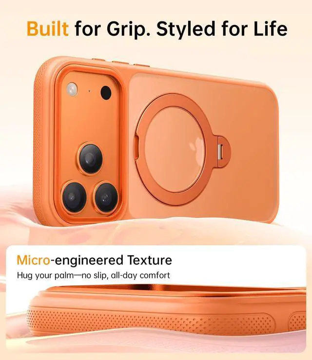 [- ]The iPhone 17 Pro case features a 3D ergonomic grip system that naturally fits the contours of your hand. The upgraded side grooves provide ergonomic support, while the nano-textured surface offers a cushioned and comfortable grip. This design effectively prevents hand fatigue, ensuring long-lasting comfort even during extended use