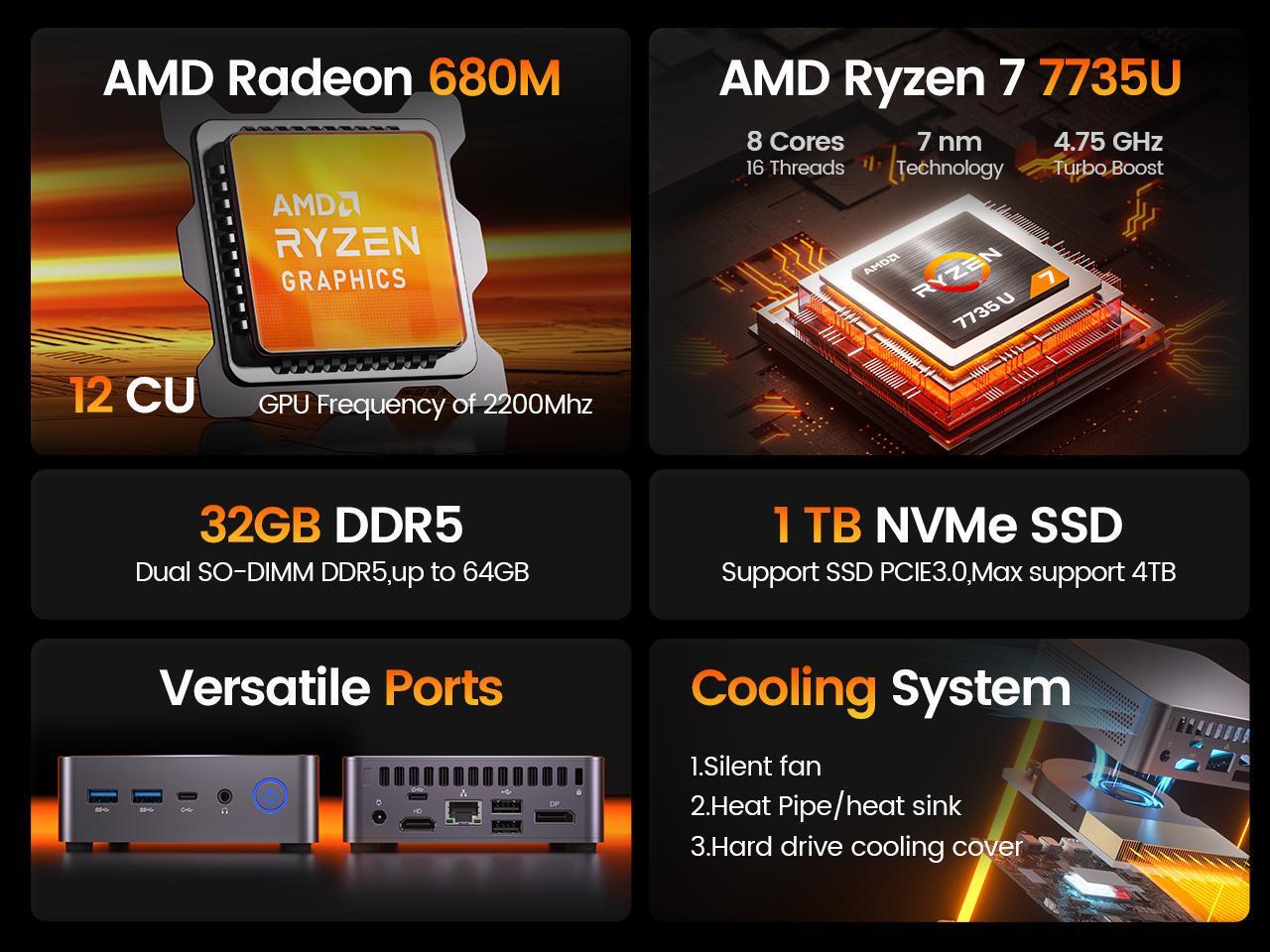 PELADN Mini PC, AMD Ryzen 7 7735U (8C/16T, Up To 4.75Ghz), 32GB DDR5/1T NVMe SSD, Dual Type-C/DP/HD, Mini Desktop Computer, WiFi6 4K/60Hz Quadruple-Display USB3.2/BT5.2 Mini Computers For Home Bus