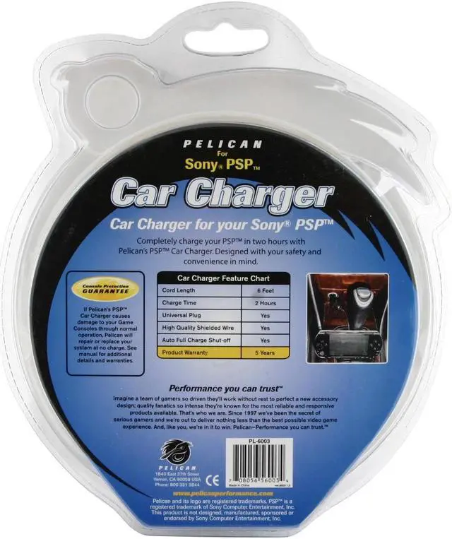 | Features | Cord Length: 6ft Charge Time: 2 Hours Universal Plug High Quality Shielded Wire Auto Full Charge Shut-off Completely charge your PSP in two hours with Pelican's PSP Car Charger. Designed with your saftey and convenience in mind. |