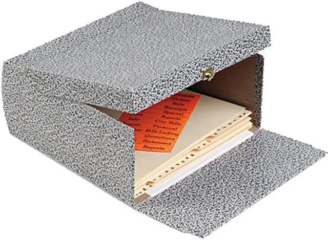 For light-duty stacking and storing, this letter size box features a pullout black binder with curved orange spine. Box has suitcase-style clasp. Box Style: N/A; Box Type: Storage; Material(s): Binder Board; Strength: Basic.