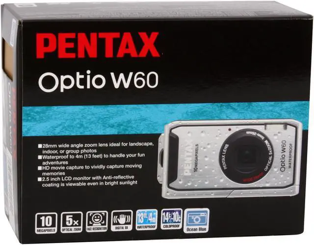 Waterproof to 13 FeetThe Pentax Optio W60 is waterproof up to 13 feet deep so you can shoot underwater or just about anywhere without worrying about rain, spills and splashes.