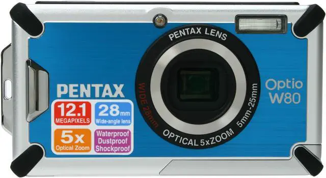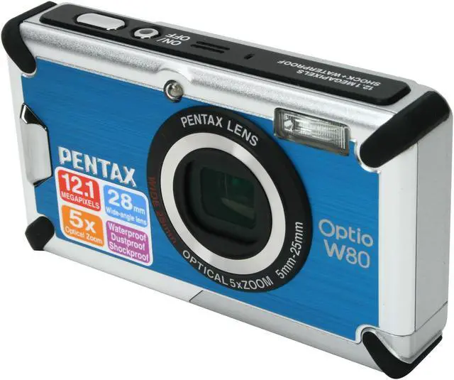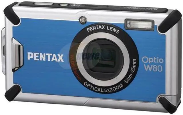 5X Wide-angle Zoom LensEquipped with a wide-angle zoom lens, the Pentax Optio W80 handles both wide-scene and close-up shots. Get the whole family and lots of friends into one shot at the 28mm wide-angle end, or take extreme close-ups via up to 31.3X zoom capability (5X optical zoom multiplies 6.25X digital zoom).