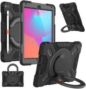 PEPKOO Triple Shockproof Case for iPad 9th/8th/7th Generation 10.2 inch 2021/2020/2019, Air 3rd Generation 10.5 inch, Heavy Duty Cover with Pencil Holder, Handle Kickstand, Shoulder Strap, Black