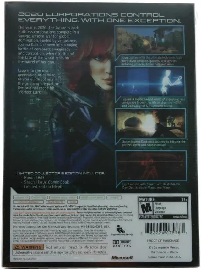 Disc One: Explore a supercharged world brought to life in stunning HDTV and Dolby Digital 5.1 Surround Sound; equip Joanna with the ultimate futuristic weapons and vehicles, including jetpacks, a hovercraft, and more; get swept into an engrossing action adventure story of high-tech corporate espionage and global conspiracy in the single-player campaign; take the fight online with numerous Xbox Live gameplay options, including Death Match, Dark-ops and Scalable Maps.
