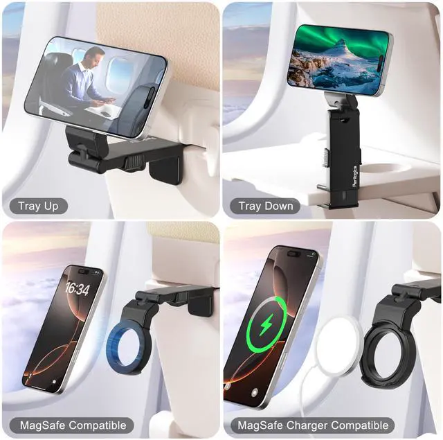 Perilogics Airplane Phone Mount Dual Function Travel Essential This compact travel gadget securely clamps to airplane tray tables (open or closed) and holds your phone for hands-free entertainment. Plus, it doubles as a headphone hangerkeeping your headset within reach and off your seat. A true must-have for frequent flyers.